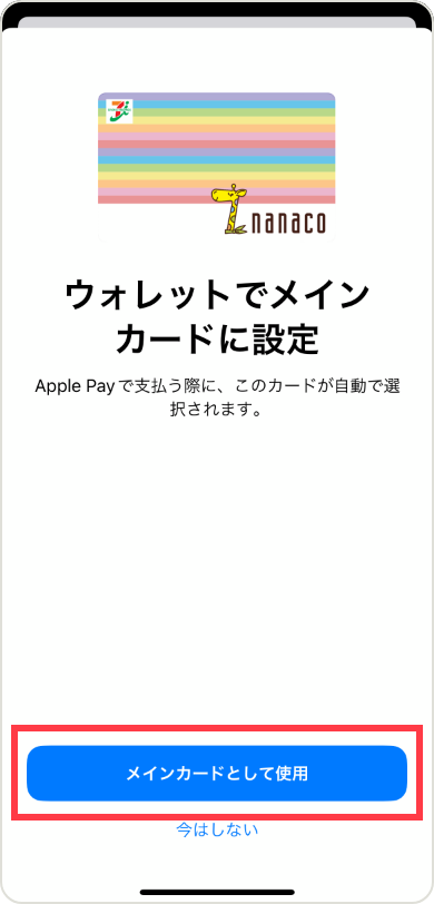 nanacoをメインカードとして使いたい場合は「メインカードとして使用」ボタンをタップします。