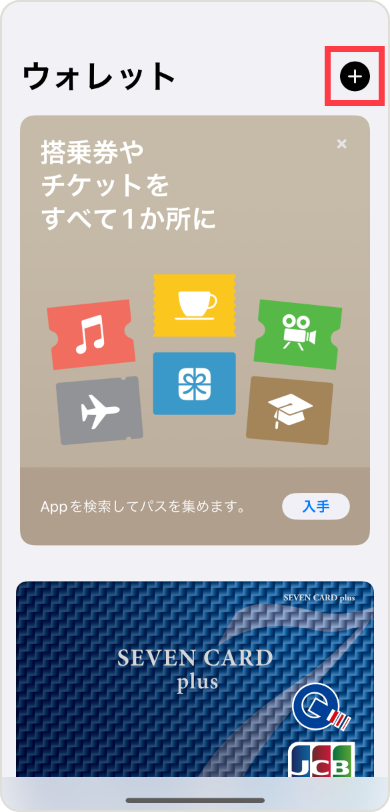 ウォレットアプリを開き、画面右上の「+」をタップします。