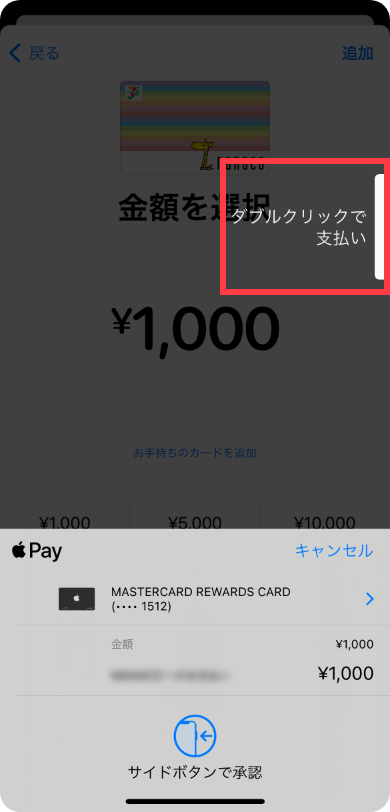 チャージするクレジットカードを選択し、iPhoneのサイドボタンをダブルクリックします。
