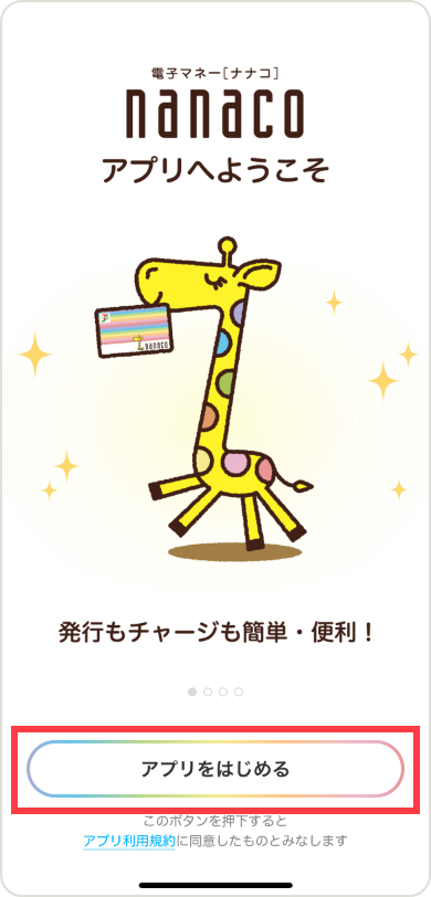 nanacoアプリを開き、「アプリをはじめる」ボタンをタップします。