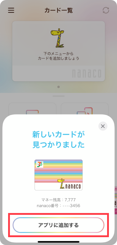 nanacoアプリを開き、「アプリに追加する」ボタンをタップします。